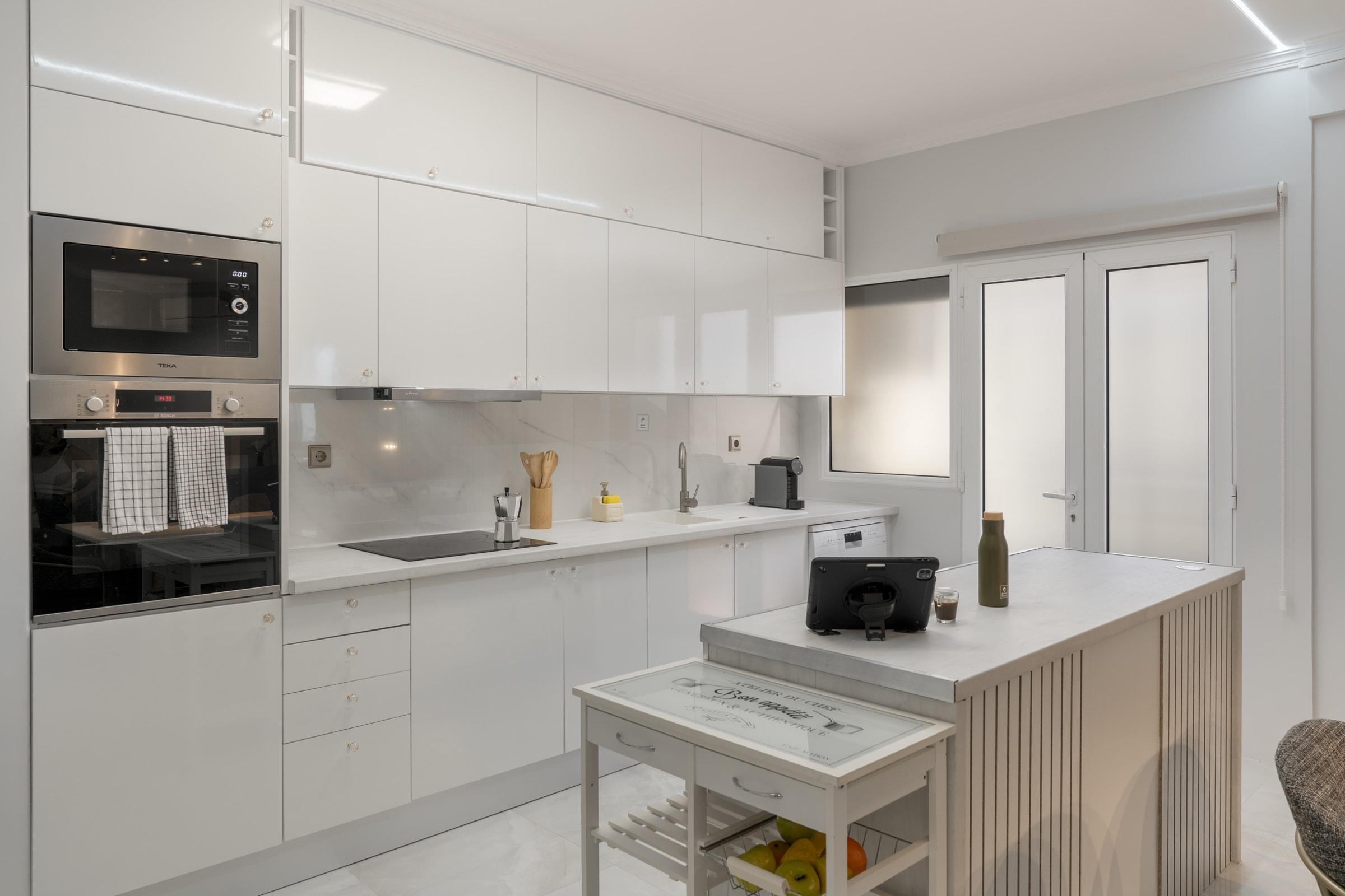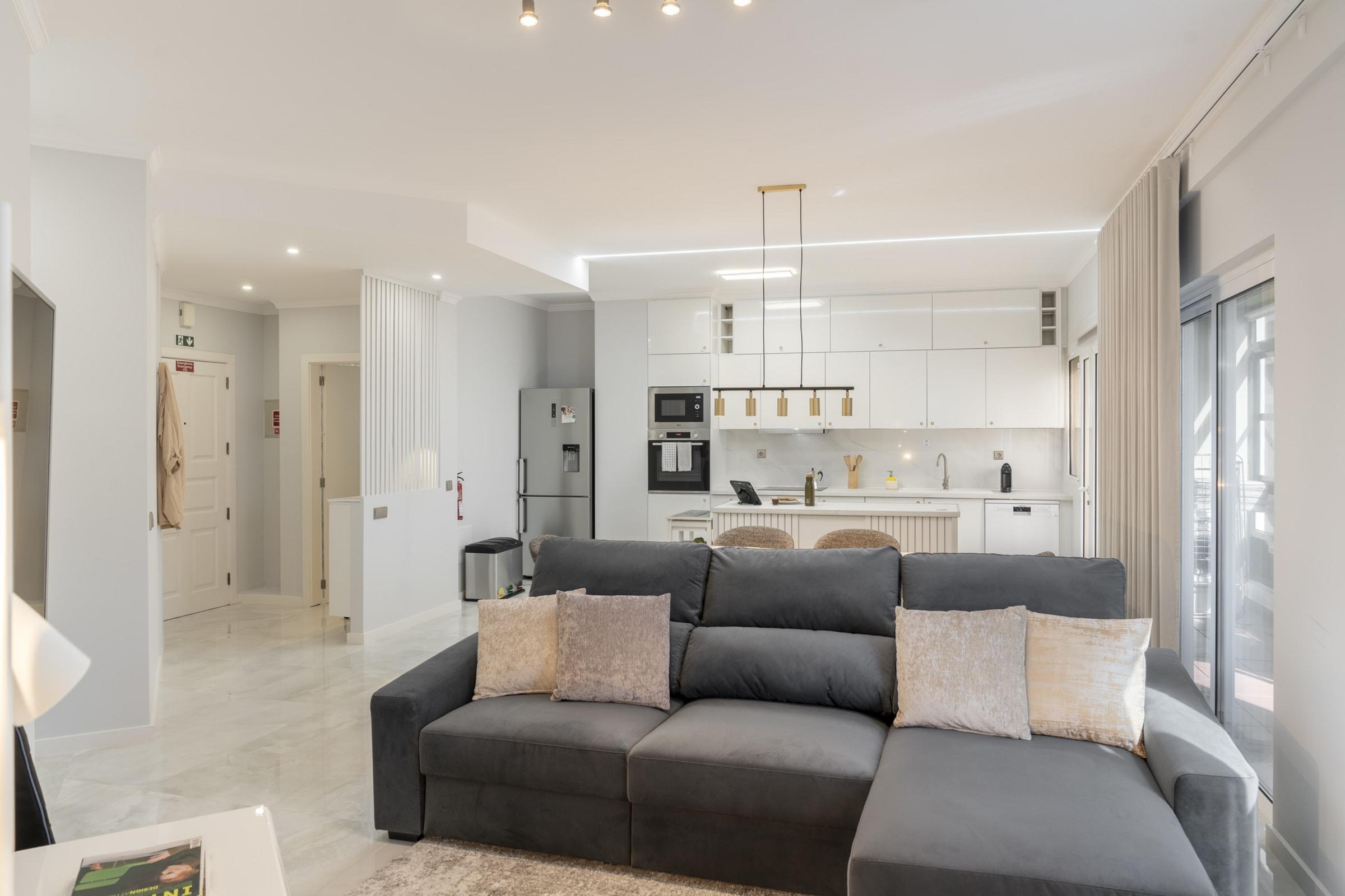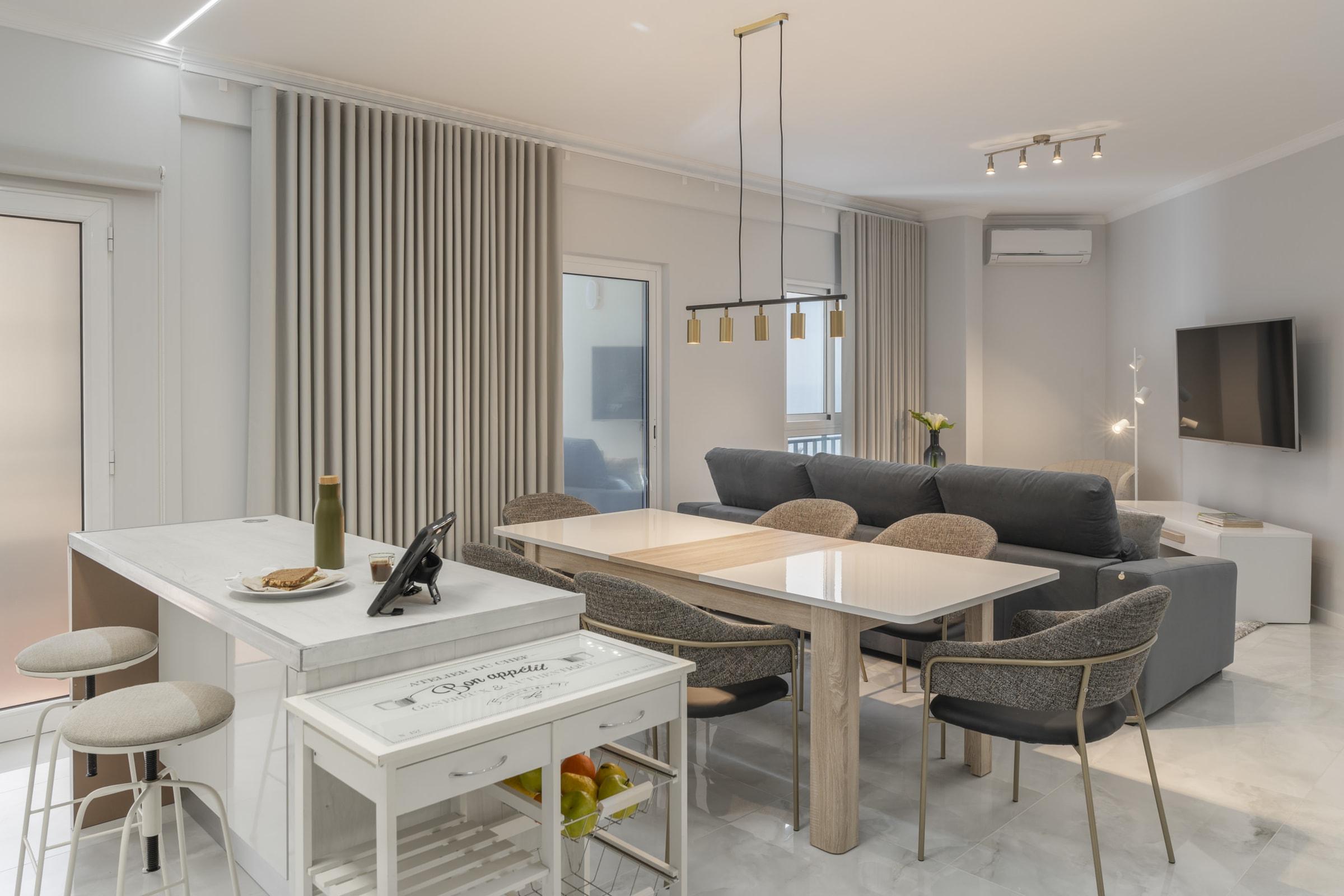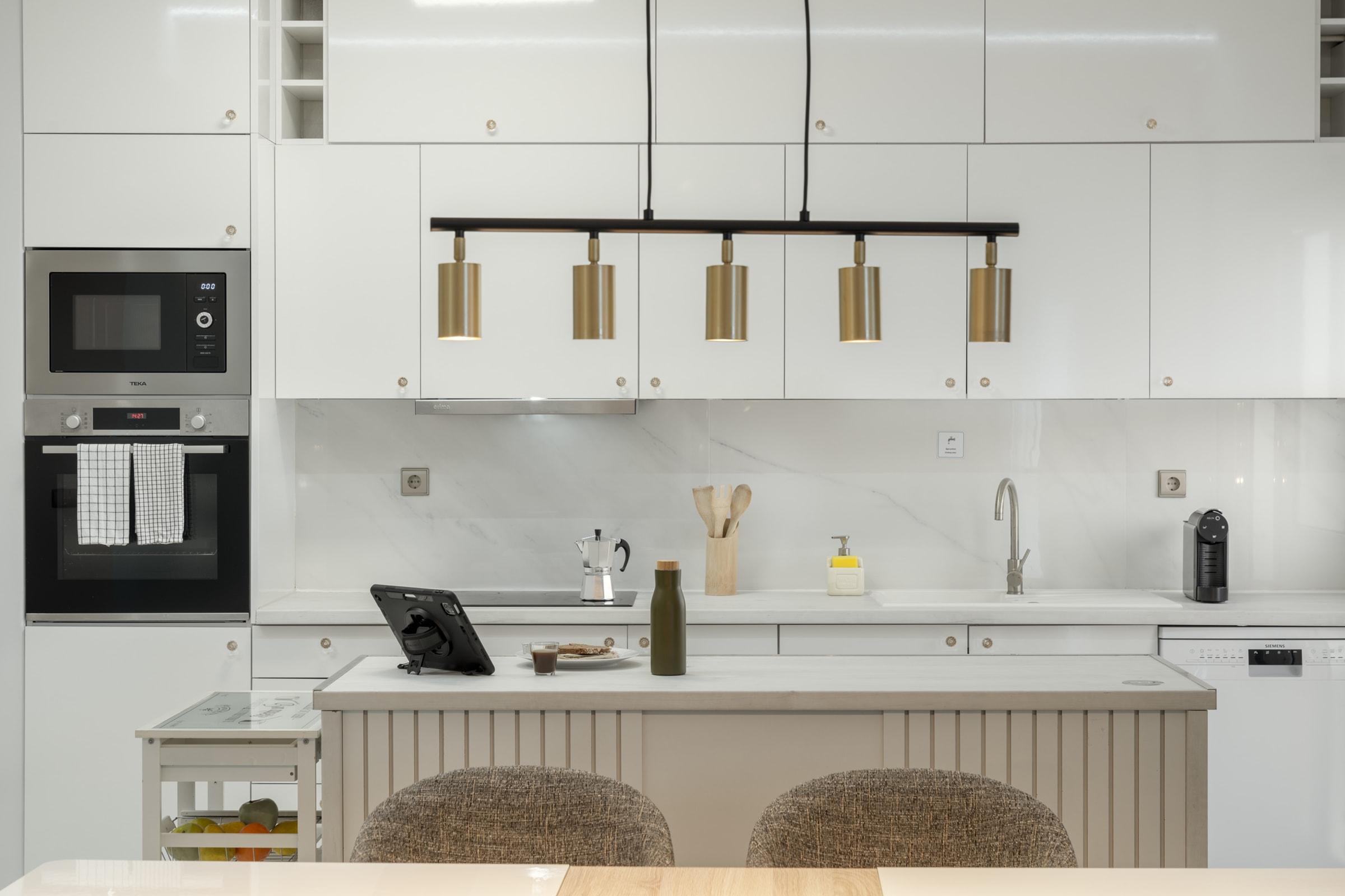 Erdvi ir pilnai įrengta virtuvė leis mėgautis savarankišku maisto ruošimu – čia rasite viską nuo orkaitės iki indaplovės ir kavos aparato. Jaukioje svetainės zonoje su oro kondicionieriumi galėsite atsipalaiduoti prie televizoriaus ar mėgautis vaizdu pro langus